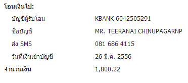 โอนเงินแล้วจำนวน 1,800.00 บาท 25 มี.ค. 56 เวลา 17.55 น.